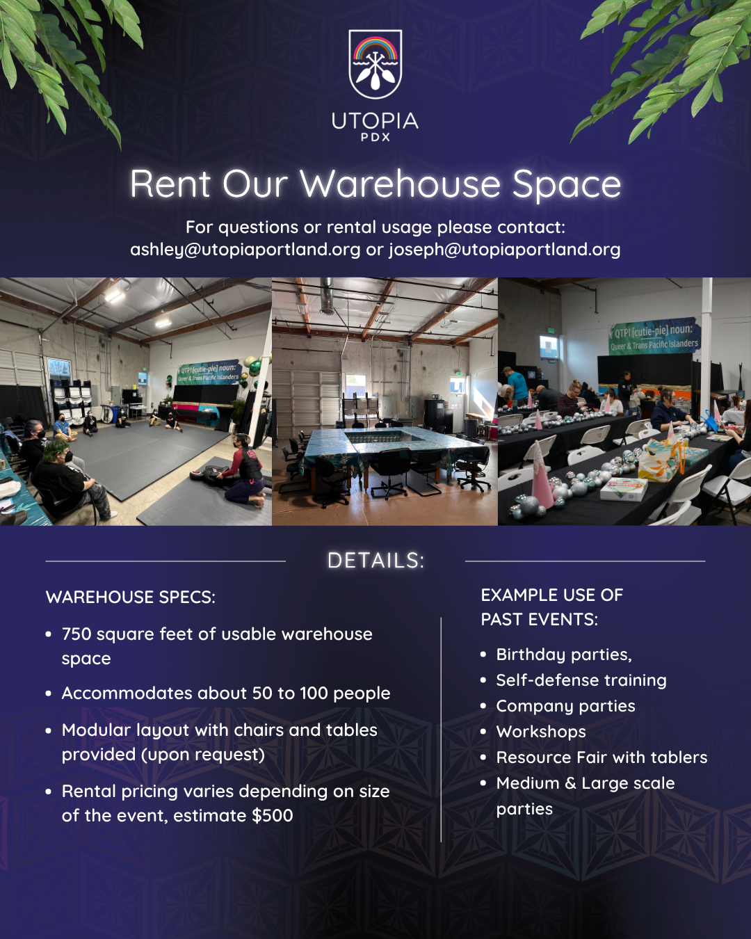 To inquire for your next event email Ashley@utopiaportland.org to go over details and setup a walk through of our space!