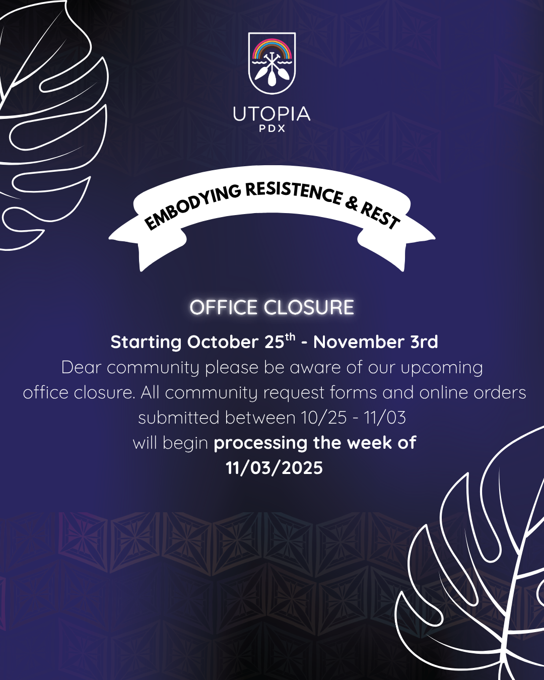 Talofa lava and hello QTPI fam, just a quick reminder that UTOPIA PDX will be closed from October 25th- November 4th, 2025. Our online Māna Merch store will close until we return and we will respond to emails and community request forms in the order we received them. Fa’afetai lava and thank you all so much for supporting UTOPIA PDX!